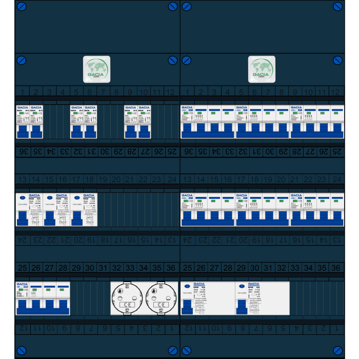 GACIA groepenkast, hoofdschakelaar, 3x aardlekschakelaar 2p/40/30mA, 2x aardlekschakelaar 4p/40A/30mA, 6x installatieautomaat 1p+n/B16, 6x installatieautomaat 3p+n/B16, tweevoudige contactdoos (3 fase)