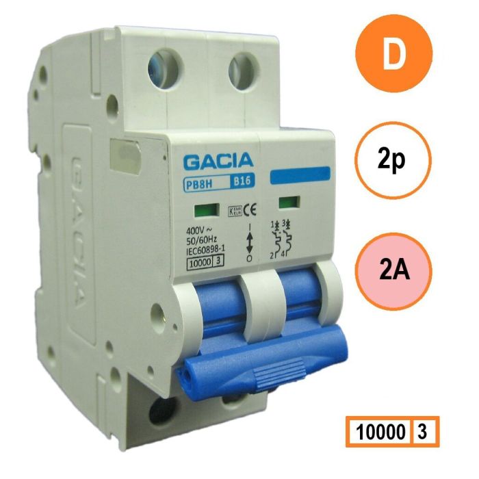 GACIA installatieautomaat 2p, D-karakteristiek, 2A, 10kA