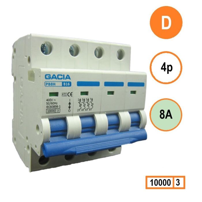 GACIA installatieautomaat 4p, D-karakteristiek, 8A, 10kA