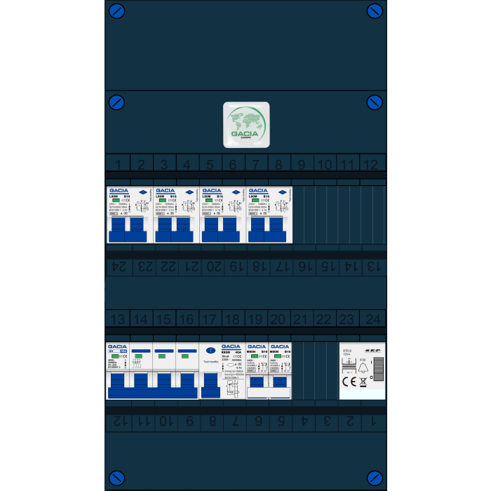 GACIA groepenkast, hoofdschakelaar, 4x aardlekautomaat, aardlekschakelaar+fornuisgroep, beltrafo (1/3 fase)