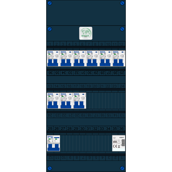 GACIA groepenkast, hoofdschakelaar, 9x aardlekautomaat, beltrafo (1 fase)