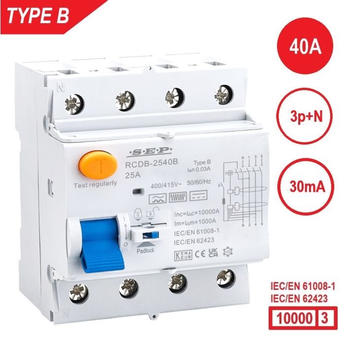 SEP aardlekschakelaar type B, 40Amp, 30mA, 10kA kan worden toegepast als 1p+n en 3p+n. Beveiliging AC+A+B type aardlekfout stromen.
