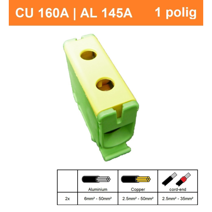 CK klem 2,5-50mm2, 1 polig, 1 fase, geel/groen