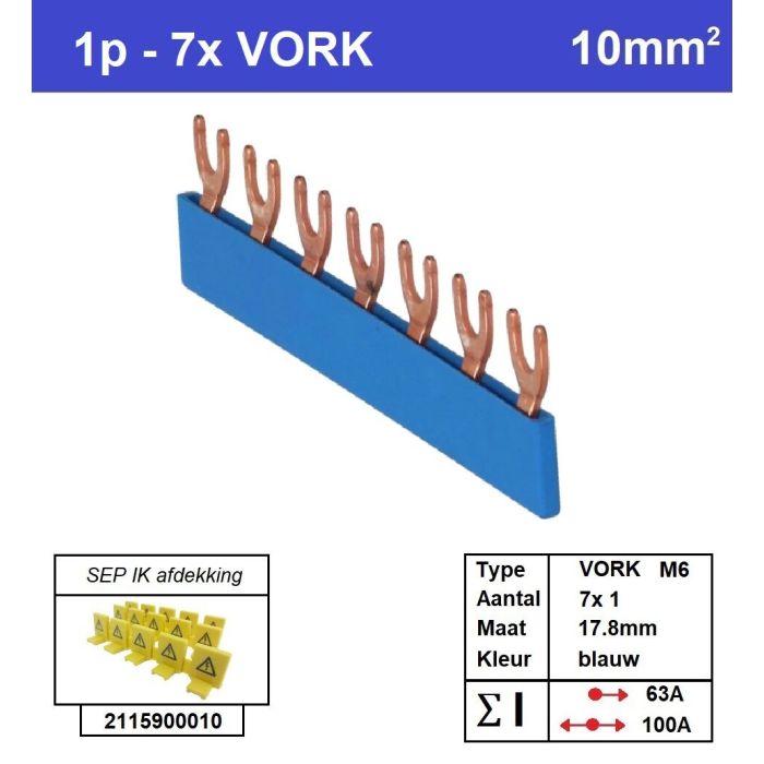 Geïsoleerde doorverbindingskam, 1 fase, 7x VORK, M6, 10mm2, 17,8mm, blauw