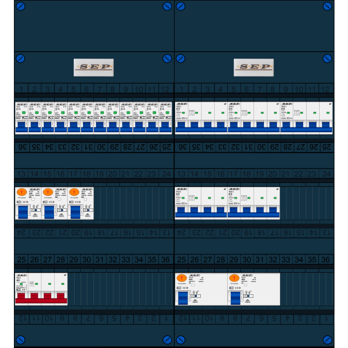 SEP FS groepenkast, hoofdschakelaar 4p/40A, 3x aardlekschakelaar 2p/40A/30mA, 2x aardlekschakelaar 4p/40A/30mA, 12x installatieautomaat 2p+n/B16, 5x installatieautomaat 4p/B16 (3 Fase)
