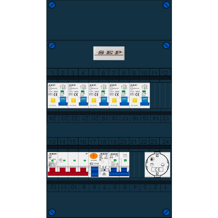 SEP FS groepenkast, hoofdschakelaar 4p/40A, 5x aardlekautomaat 1p+n/B16/30mA, 1x als+installatieautomaat 2p+2n/B16, enkelvoudige contactdoos (3 Fase)