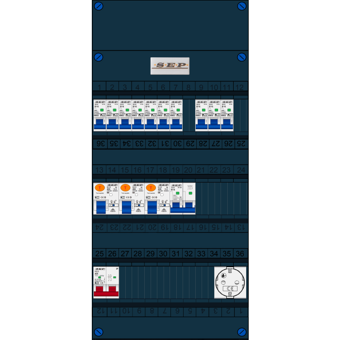 SEP FS groepenkast, hoofdschakelaar 2p/40A, 3x aardlekschakelaar 2p/40A/30mA, 10x installatieautomaat 1p+n/B16, 1x Installatieautomaat 2p+2n/B16, 1x Wandcontactdoos (1 fase)