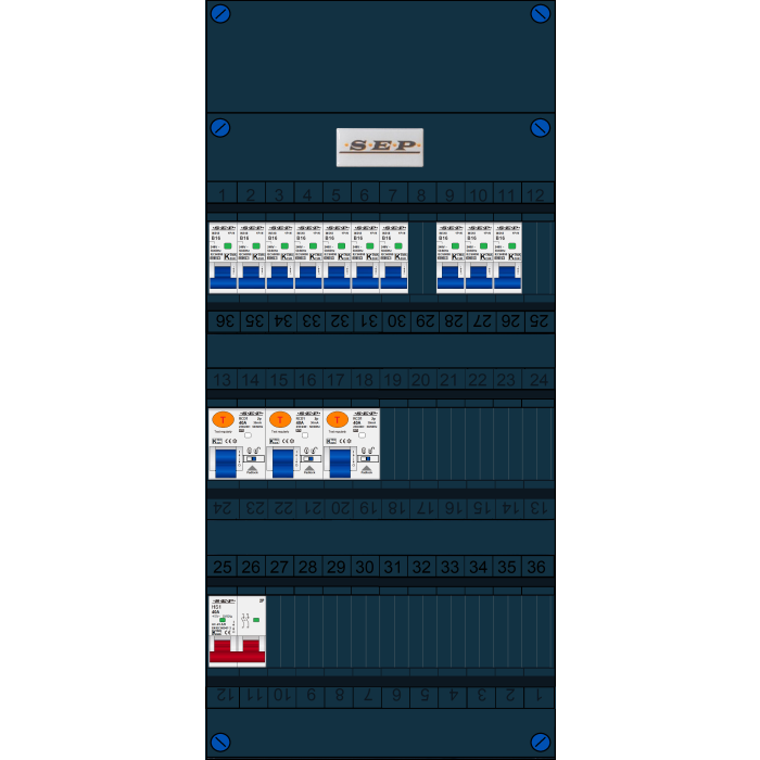 SEP FS groepenkast, hoofdschakelaar 2p/40A, 3x aardlekschakelaar 2p/40A/30mA, 10x installatieautomaat 1p+n/B16 (1 fase)