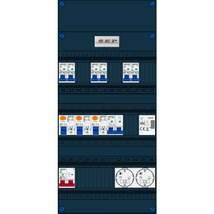 SEP FS groepenkast, hoofdschakelaar 2p/40A, 3x aardlekschakelaar 2p/40A/30mA, 6x installatieautomaat 1p+n/B16, 1x Installatieautomaat 2p+2n/B16, 1x Beltrafo, 2x Wandcontactdoos (1 fase)