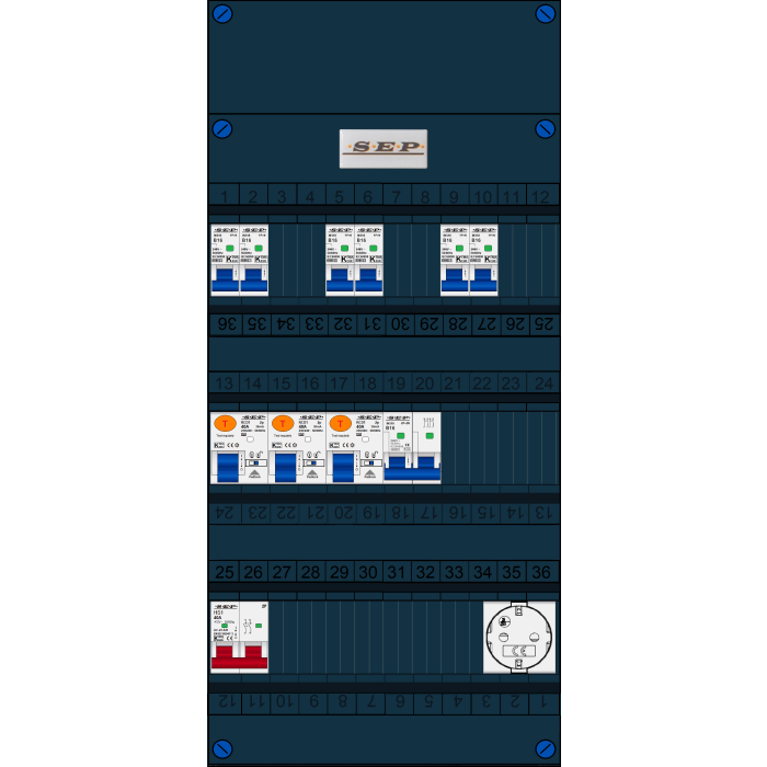 SEP FS groepenkast, hoofdschakelaar 2p/40A, 3x aardlekschakelaar 2p/40A/30mA, 6x installatieautomaat 1p+n/B16, 1x Installatieautomaat 2p+2n/B16, 1x Wandcontactdoos (1 fase)