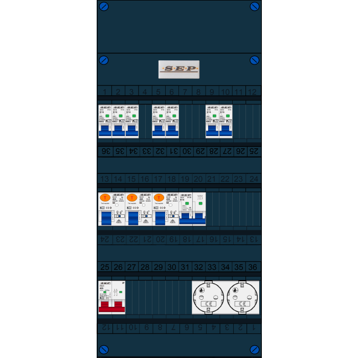 SEP FS groepenkast, hoofdschakelaar 2p/40A, 3x aardlekschakelaar 2p/40A/30mA, 7x installatieautomaat 1p+n/B16, 1x Installatieautomaat 2p+2n/B16, 2x Wandcontactdoos (1 fase)