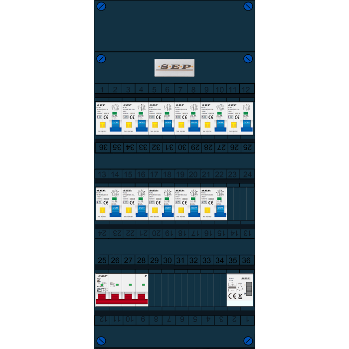 SEP FS groepenkast, hoofdschakelaar 4p/40A, 11x aardlekautomaat 1p+n/B16/30mA, beltrafo (3 Fase)
