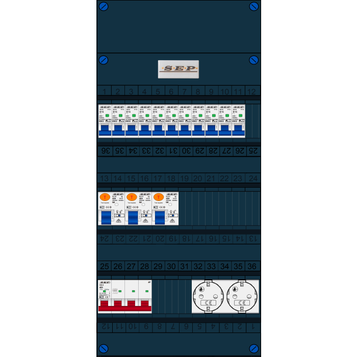 SEP FS groepenkast, hoofdschakelaar 4p/40A, 3x aardlekschakelaar 2p/40A/30mA, 11x installatieautomaat 1p+n/B16, 2x wandcontactdoos (3 Fase)