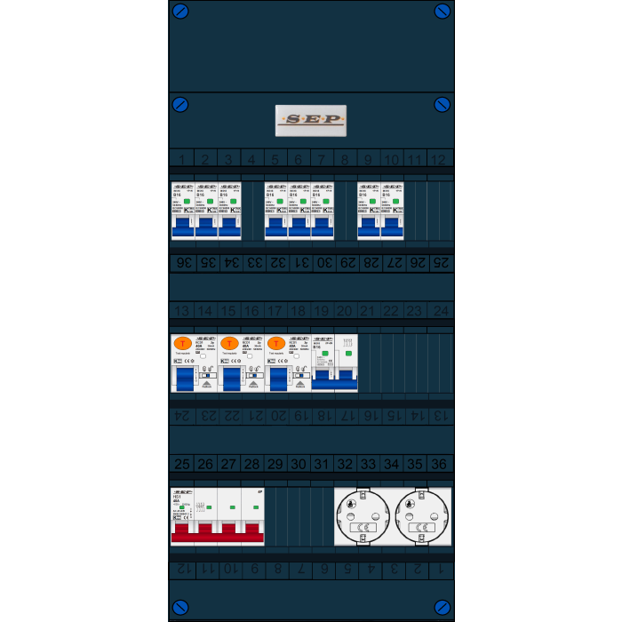 SEP FS groepenkast, hoofdschakelaar 4p/40A, 3x aardlekschakelaar 2p/40A/30mA, 8x installatieautomaat 1p+n/B16, 1x installatieautomaat 2p+2n/B16, 2x wandcontactdoos (3 Fase)
