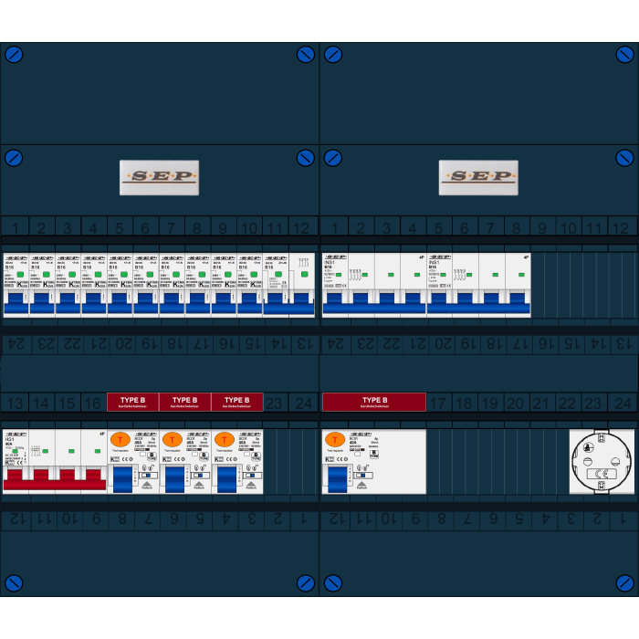 SEP FS groepenkast, hoofdschakelaar 4p/40A, 3x aardlekschakelaar 2p/40A/30mA (Type B), 1x aardlekschakelaar 4p/40A/30mA (Type B), 10x installatieautomaat 1p+n/B16, 2x installatieautomaat 4p/B16, 1x installatieautomaat 2p+2n/B16 (3 fase), enkelvoudige contactdoos