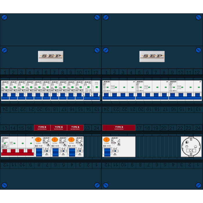 SEP FS groepenkast, hoofdschakelaar 4p/40A, 3x aardlekschakelaar 2p/40A/30mA (Type B), 1x aardlekschakelaar 4p/40A/30mA (Type B), 10x installatieautomaat 1p+n/B16, 3x installatieautomaat 4p/B16, 1x installatieautomaat 2p+2n/B16 (3 fase), enkelvoudige contactdoos