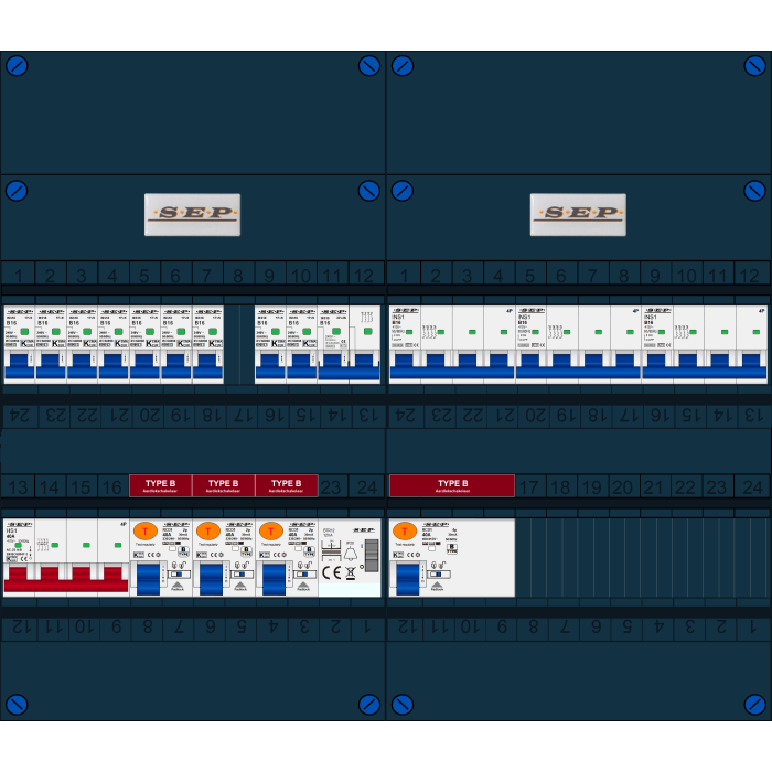 SEP FS groepenkast, hoofdschakelaar 4p/40A, 3x aardlekschakelaar 2p/40A/30mA (Type B), 1x aardlekschakelaar 4p/40A/30mA (Type B), 9x installatieautomaat 1p+n/B16, 3x installatieautomaat 4p/B16, 1x installatieautomaat 2p+2n/B16, beltrafo (3 fase)