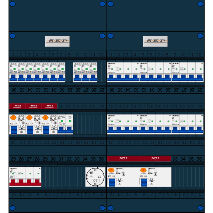 SEP FS groepenkast, hoofdschakelaar 4p/40A, 3x aardlekschakelaar 2p/40A/30mA (Type B), 2x aardlekschakelaar 4p/40A/30mA (Type B), 10x installatieautomaat 1p+n/B16, 6x installatieautomaat 4p/B16, 1x installatieautomaat 2p+2n/B16 (3 fase), enkelvoudige contactdoos