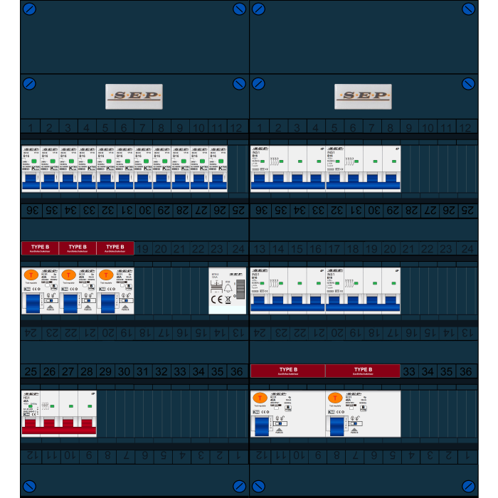 SEP FS groepenkast, hoofdschakelaar 4p/40A, 3x aardlekschakelaar 2p/40A/30mA (Type B), 2x aardlekschakelaar 4p/40A/30mA (Type B), 11x installatieautomaat 1p+n/B16, 4x installatieautomaat 4p/B16, beltrafo (3 fase)