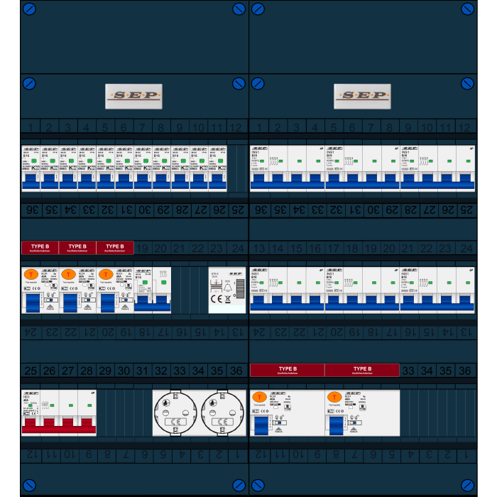 SEP FS groepenkast, hoofdschakelaar 4p/40A, 3x aardlekschakelaar 2p/40A/30mA (Type B), 2x aardlekschakelaar 4p/40A/30mA (Type B), 11x installatieautomaat 1p+n/B16, 6x installatieautomaat 4p/B16, 1x installatieautomaat 2p+2n/B16, beltrafo, tweevoudige contactdoos (3 fase)