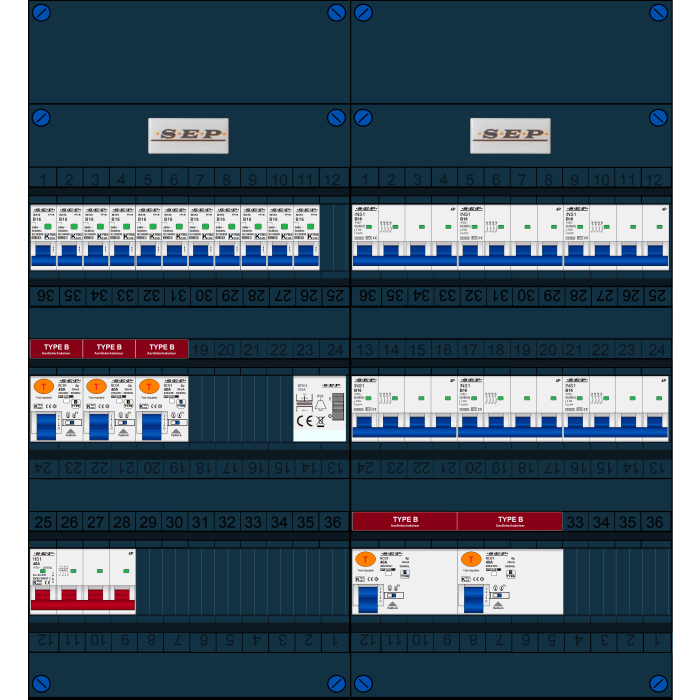 SEP FS groepenkast, hoofdschakelaar 4p/40A, 3x aardlekschakelaar 2p/40A/30mA (Type B), 2x aardlekschakelaar 4p/40A/30mA (Type B), 11x installatieautomaat 1p+n/B16, 6x installatieautomaat 4p/B16, beltrafo (3 fase)