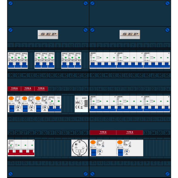 SEP FS groepenkast, hoofdschakelaar 4p/40A, 3x aardlekschakelaar 2p/40A/30mA (Type B), 2x aardlekschakelaar 4p/40A/30mA (Type B), 9x installatieautomaat 1p+n/B16, 6x installatieautomaat 4p/B16, 1x installatieautomaat 2p+2n/B16, beltrafo, enkelvoudige contactdoos (3 fase)