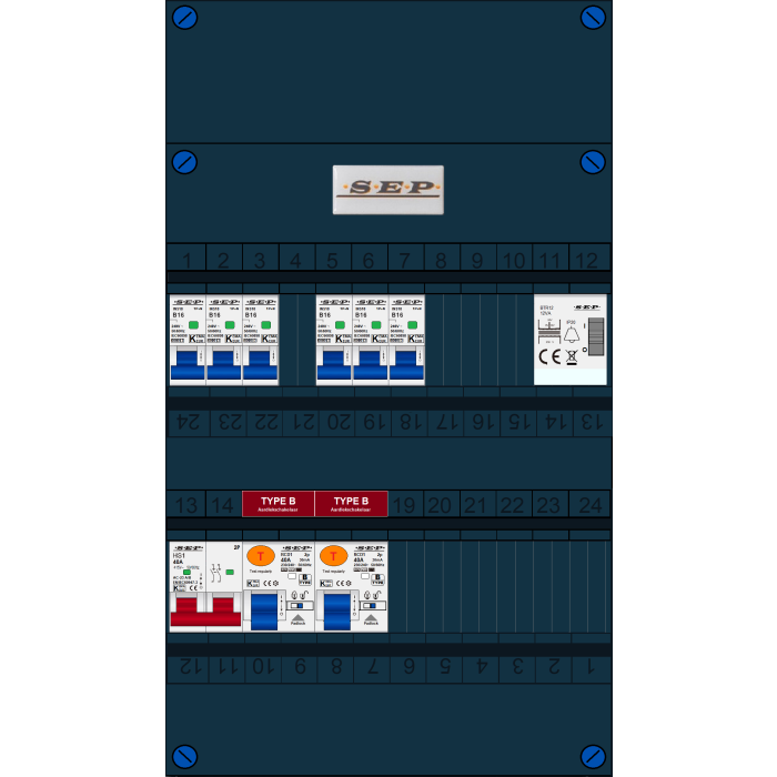 SEP FS groepenkast, hoofdschakelaar 2p/40A, 2x aardlekschakelaar 2p/40A/30mA (Type B), 6x installatieautomaat 1p+n/B16, beltrafo (1 fase)