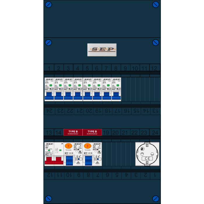 SEP FS groepenkast, hoofdschakelaar 2p/40A, 2x aardlekschakelaar 2p/40A/30mA (Type B), 8x installatieautomaat 1p+n/B16, enkelvoudige contactdoos (1 fase)