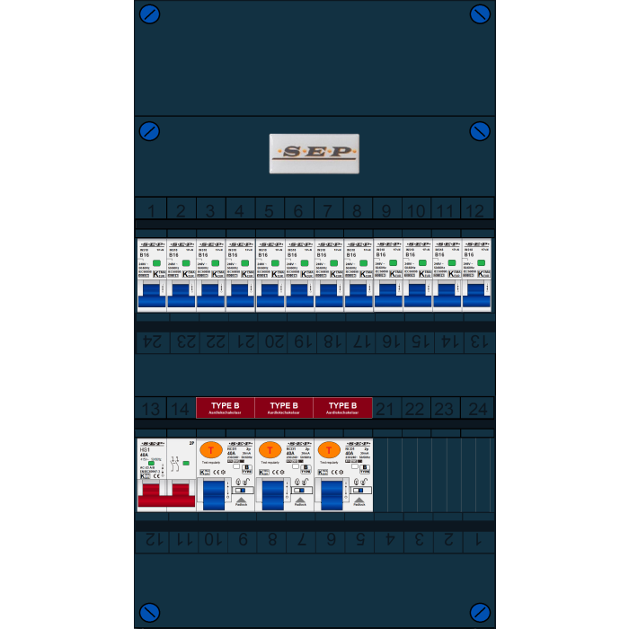SEP FS groepenkast, hoofdschakelaar 2p/40A, 3x aardlekschakelaar 2p/40A/30mA (Type B), 12x installatieautomaat 1p+n/B16 (1 fase)