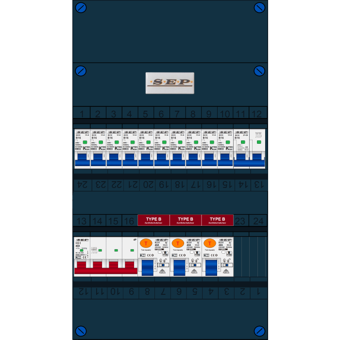 SEP FS groepenkast, hoofdschakelaar 4p/40A, 3x aardlekschakelaar 2p/40A/30mA (Type B), 10x installatieautomaat 1p+n/B16, 1x installatieautomaat 2p+2n/B16 (3 fase)