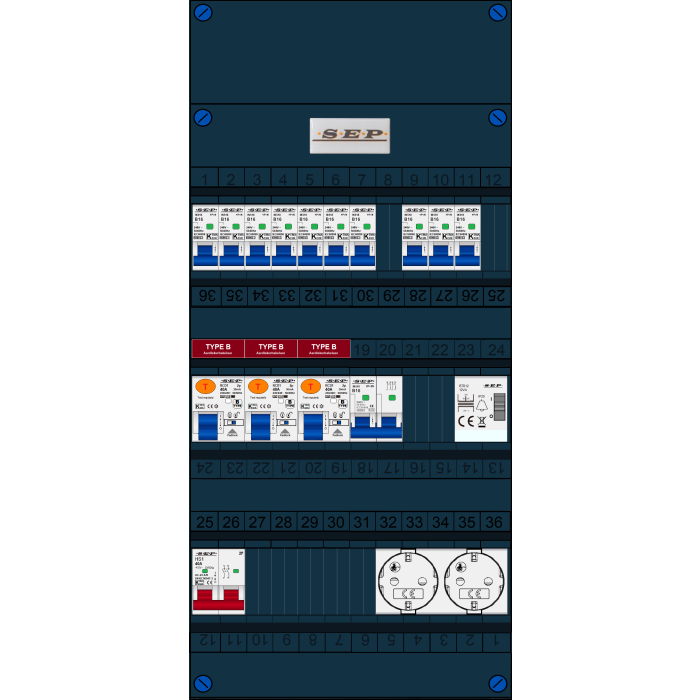 SEP FS groepenkast, hoofdschakelaar 2p/40A, 3x aardlekschakelaar 2p/40A/30mA (Type B), 10x installatieautomaat 1p+n/B16, 1x installatieautomaat 2p+2n/B16, beltrafo, tweevoudige contactdoos (1 fase)