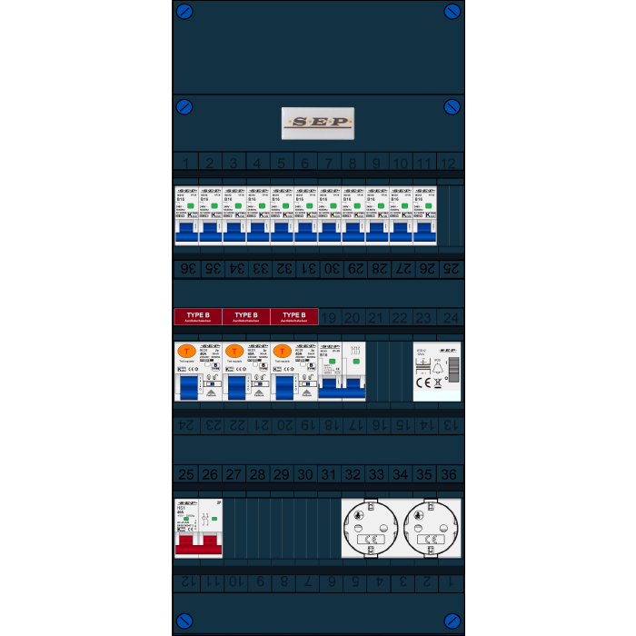 SEP FS groepenkast, hoofdschakelaar 2p/40A, 3x aardlekschakelaar 2p/40A/30mA (Type B), 11x installatieautomaat 1p+n/B16, 1x installatieautomaat 2p+2n/B16, beltrafo, tweevoudige contactdoos (1 fase)