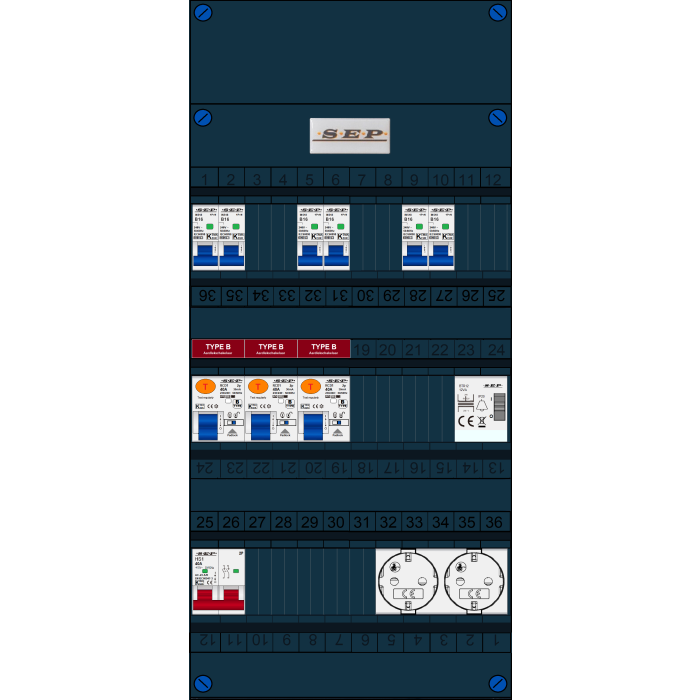 SEP FS groepenkast, hoofdschakelaar 2p/40A, 3x aardlekschakelaar 2p/40A/30mA (Type B), 6x installatieautomaat 1p+n/B16, beltrafo, tweevoudige contactdoos (1 fase)