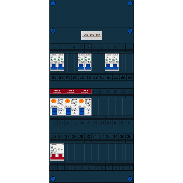 SEP FS groepenkast, hoofdschakelaar 2p/40A, 3x aardlekschakelaar 2p/40A/30mA (Type B), 6x installatieautomaat 1p+n/B16 (1 fase)