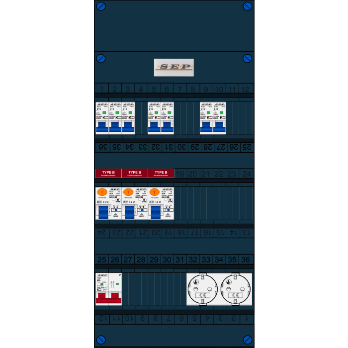 SEP FS groepenkast, hoofdschakelaar 2p/40A, 3x aardlekschakelaar 2p/40A/30mA (Type B), 7x installatieautomaat 1p+n/B16, tweevoudige contactdoos (1 fase)