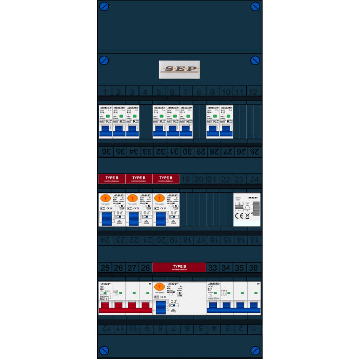 SEP FS groepenkast, hoofdschakelaar 4p/40A, 3x aardlekschakelaar 2p/40A/30mA (Type B), 1x aardlekschakelaar 4p/40A/30mA (Type B), 8x installatieautomaat 1p+n/B16, 1x installatieautomaat 4p/B16, beltrafo (3 fase)