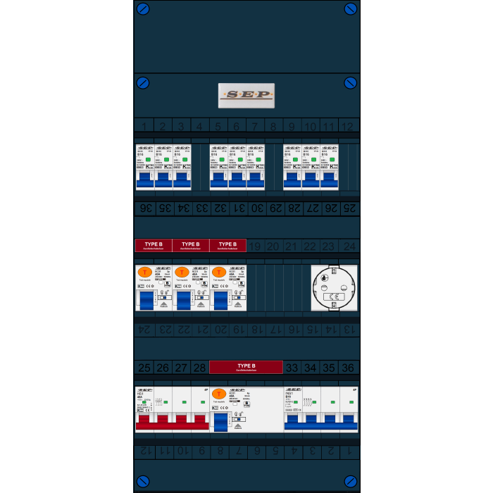 SEP FS groepenkast, hoofdschakelaar 4p/40A, 3x aardlekschakelaar 2p/40A/30mA (Type B), 1x aardlekschakelaar 4p/40A/30mA (Type B), 9x installatieautomaat 1p+n/B16, 1x installatieautomaat 4p/B16, enkelvoudige contactdoos (3 fase)