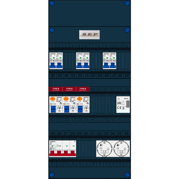 SEP FS groepenkast, hoofdschakelaar 4p/40A, 3x aardlekschakelaar 2p/40A/30mA (Type B), 6x installatieautomaat 1p+n/B16, beltrafo, tweevoudige contactdoos (3 fase)