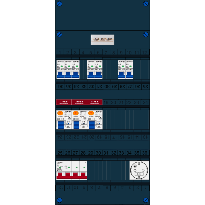 SEP FS groepenkast, hoofdschakelaar 4p/40A, 3x aardlekschakelaar 2p/40A/30mA (Type B), 7x installatieautomaat 1p+n/B16, enkelvoudige contactdoos (3 fase)