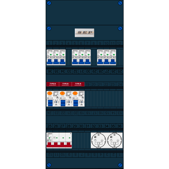 SEP FS groepenkast, hoofdschakelaar 4p/40A, 3x aardlekschakelaar 2p/40A/30mA (Type B), 9x installatieautomaat 1p+n/B16, tweevoudige contactdoos (3 fase)