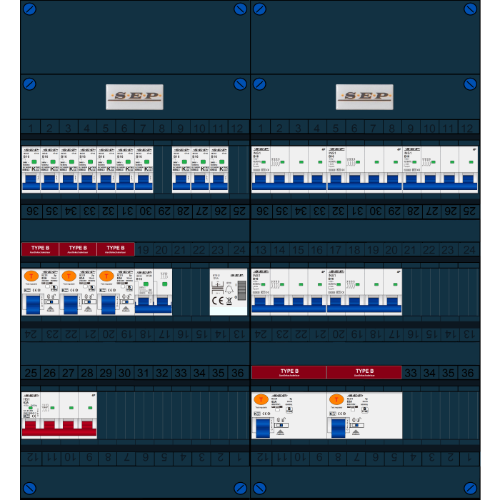 SEP FS groepenkast, hoofdschakelaar 4p/63A, 3x aardlekschakelaar 2p/63A/30mA (Type B), 2x aardlekschakelaar 4p/63A/30mA (Type B), 10x installatieautomaat 1p+n/B16, 5x installatieautomaat 4p/B16, 1x installatieautomaat 2p+2n/B16, beltrafo (3 fase)