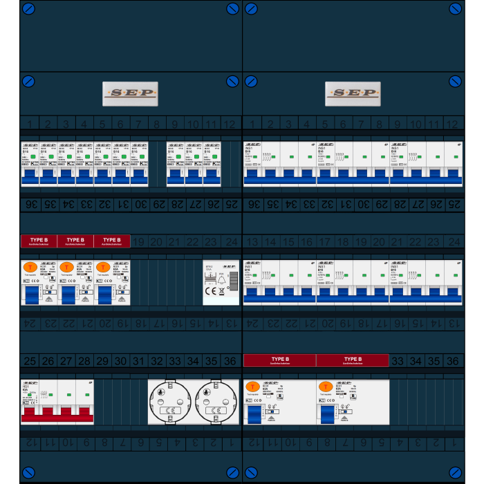 SEP FS groepenkast, hoofdschakelaar 4p/63A, 3x aardlekschakelaar 2p/63A/30mA (Type B), 2x aardlekschakelaar 4p/63A/30mA (Type B), 10x installatieautomaat 1p+n/B16, 6x installatieautomaat 4p/B16, beltrafo, tweevoudige contactdoos (3 fase)