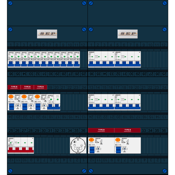 SEP FS groepenkast, hoofdschakelaar 4p/63A, 3x aardlekschakelaar 2p/63A/30mA (Type B), 2x aardlekschakelaar 4p/63A/30mA (Type B), 11x installatieautomaat 1p+n/B16, 4x installatieautomaat 4p/B16, 1x installatieautomaat 2p+2n/B16 (3 fase), enkelvoudige contactdoos