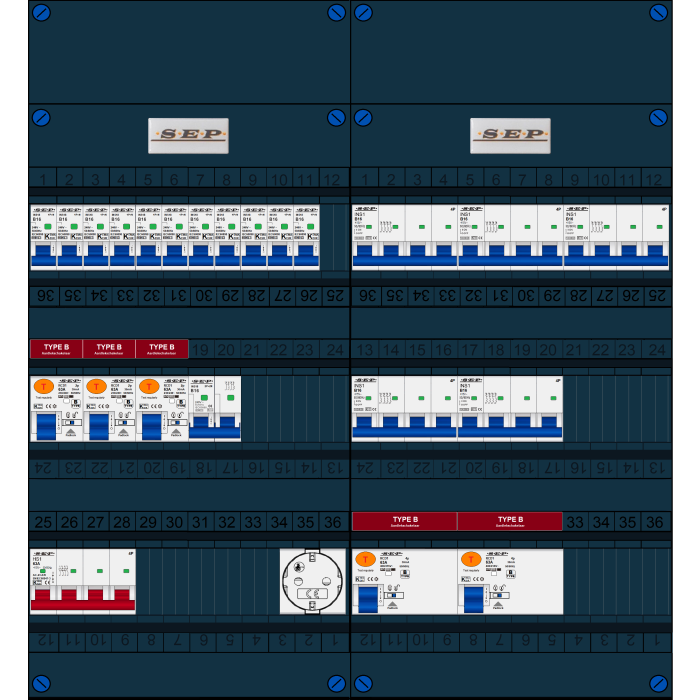 SEP FS groepenkast, hoofdschakelaar 4p/63A, 3x aardlekschakelaar 2p/63A/30mA (Type B), 2x aardlekschakelaar 4p/63A/30mA (Type B), 11x installatieautomaat 1p+n/B16, 5x installatieautomaat 4p/B16, 1x installatieautomaat 2p+2n/B16 (3 fase), enkelvoudige contactdoos