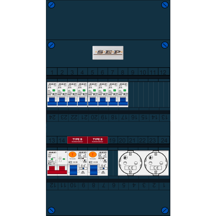 SEP FS groepenkast, hoofdschakelaar 2p/63A, 2x aardlekschakelaar 2p/63A/30mA (Type B), 8x installatieautomaat 1p+n/B16, tweevoudige contactdoos (1 fase)