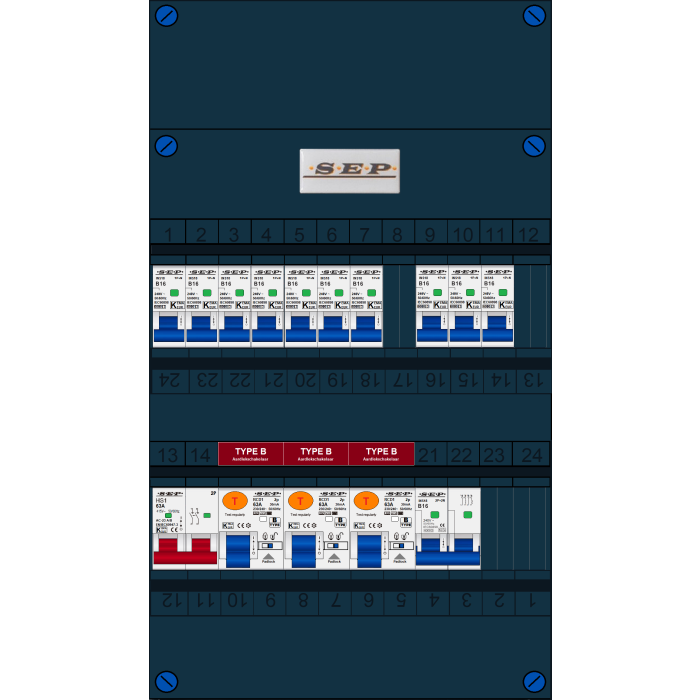 SEP FS groepenkast, hoofdschakelaar 2p/63A, 3x aardlekschakelaar 2p/63A/30mA (Type B), 10x installatieautomaat 1p+n/B16, 1x installatieautomaat 2p+2n/B16 (1 fase)