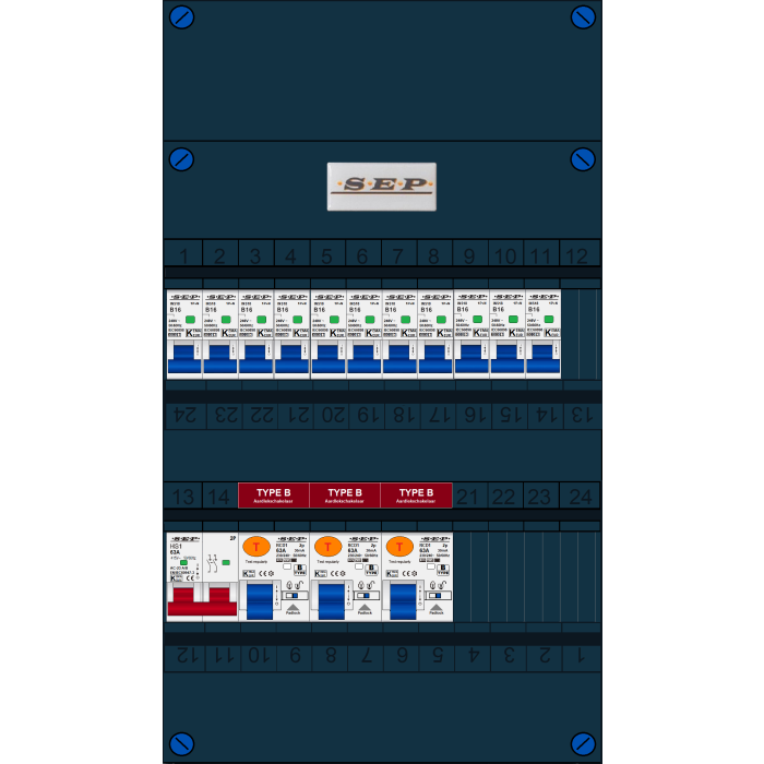 SEP FS groepenkast, hoofdschakelaar 2p/63A, 3x aardlekschakelaar 2p/63A/30mA (Type B), 11x installatieautomaat 1p+n/B16 (1 fase)