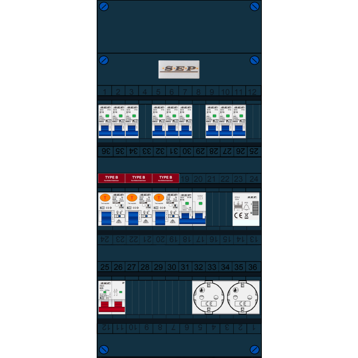 SEP FS groepenkast, hoofdschakelaar 2p/63A, 3x aardlekschakelaar 2p/63A/30mA (Type B), 9x installatieautomaat 1p+n/B16, 1x installatieautomaat 2p+2n/B16, beltrafo, tweevoudige contactdoos (1 fase)