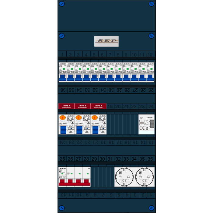 SEP FS groepenkast, hoofdschakelaar 4p/63A, 3x aardlekschakelaar 2p/63A/30mA (Type B), 12x installatieautomaat 1p+n/B16, beltrafo, tweevoudige contactdoos (3 fase)