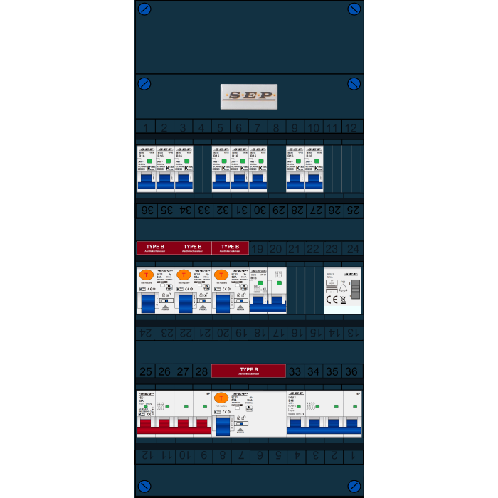 SEP FS groepenkast, hoofdschakelaar 4p/63A, 3x aardlekschakelaar 2p/63A/30mA (Type B), 1x aardlekschakelaar 4p/63A/30mA (Type B), 8x installatieautomaat 1p+n/B16, 1x installatieautomaat 4p/B16, 1x installatieautomaat 2p+2n/B16, beltrafo (3 fase)